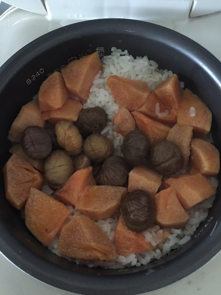 ご飯2カップ。に昆布茶ティースプーン2杯半をいれ、大き目に切った柿を投入。柿は中程度の大きさで固めの物を。小さく切ると炊きあがって混ぜるときに溶けちゃうσ(^_^;)