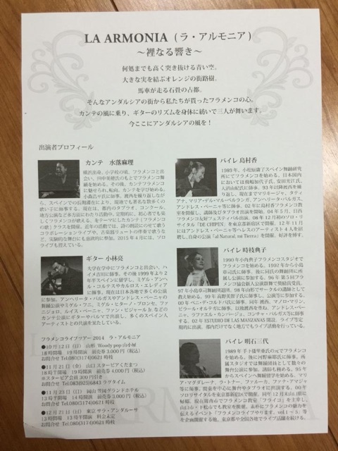 さて、夏にまだしがみつきたい私ですが、空の雲や空気はすっかり秋模様。秋と言えば、そう!山形山小屋LIVE! 今年もそんな季節になりました^_^ 10月12日日曜日 山形長谷堂のWODDY POP 千葉。において18時開場19時開演。 チケットはワンドリンク込みで3000円。 直会はグランドホテル中華のバイキングに飲み放題で2000円となります。 LIVE会場がそのまま直会開場に変身!お時間あれば是非最後まで参加下さい^_^ 秋に始めるツアーARMONIAの初日でもあります!新しい試みもありワクワクします。 ギター。小林亮 カンテ。森かおり バイレ。島村香、明石三代、時枝典子がみなさんに元気と情熱をお届けします! |