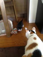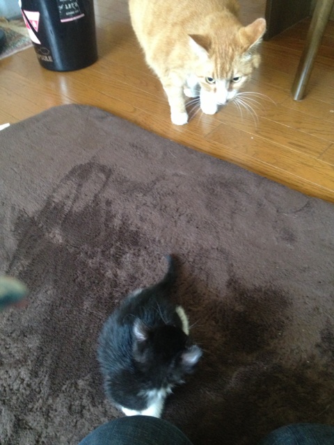名前はまだありません。 お母さんに救助されてはや二週間。ぼくはウンチも一人で出来るし、ご飯も食べれるようになってこのお家にやってきた。 すずねーさんに、ふーーっ!!と威嚇されて椅子の下に逃げ込み、たびにぃさんにも、ぐうぉーーーっ!と怒鳴られビビってへたり込んだりしたけどお母さんの胸のうでうっとりとして、そろそろお部屋探検に出かけたりしてみようかなぁ、と思っています。 兄弟たちと離れたけど淋しい実感はまだない。夜になったら淋しくなるかも。 このお家は狭い僕しか入れない隙間が沢山あってウキウキ^ ^ 他の兄弟も早く貰われていくといいなぁ。 すずねーさんとたびにぃさんに早く僕の事認めて欲しい! |